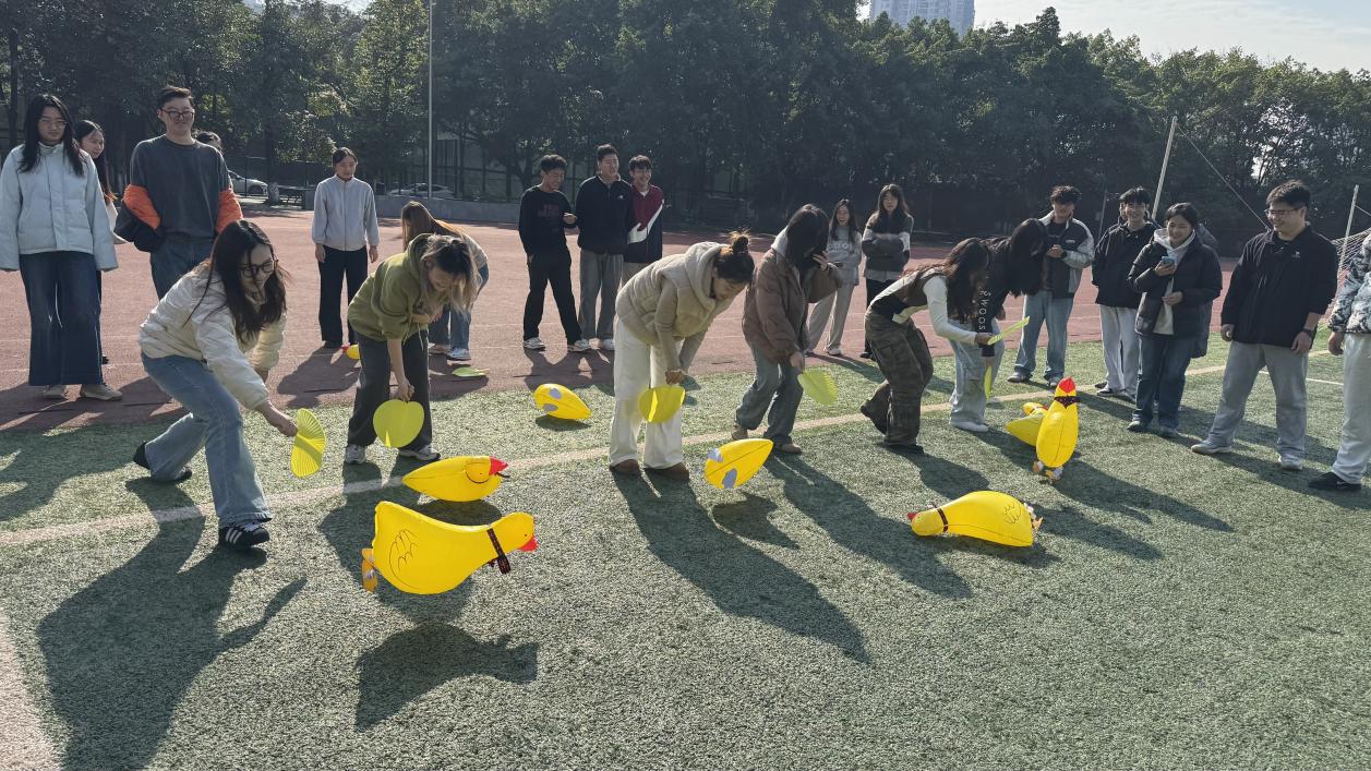 “赶鸭子上架”项目中,随着裁判一声令下,选手们应声而出。只见他们手中的扇子佛被施了魔法,小心翼翼地引导着“鸭子”前进。然而,这只“鸭子”却并不安分,时而任性偏离赛道,冲向场边的啦啦队;时而“原地踏步”,急得选手满头大汗。参赛选手笨拙又认真的模样引得围观同学阵阵喝彩。