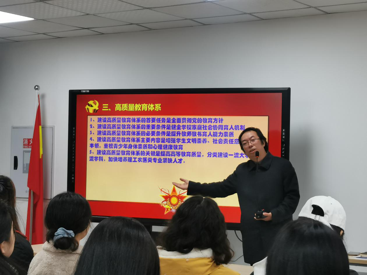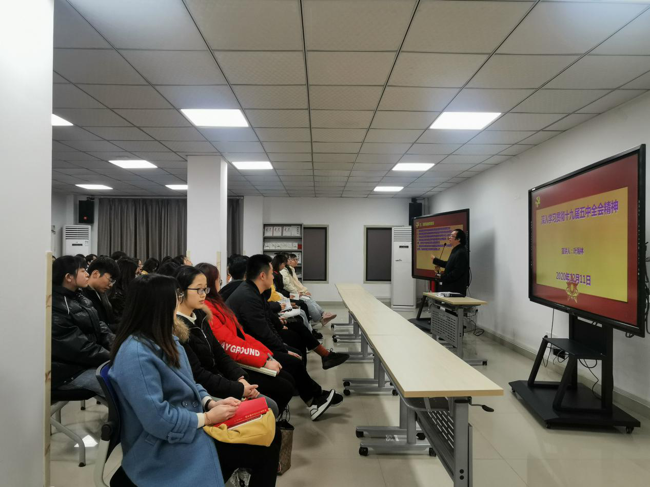 下午13时,宣讲会准时开始。叶海林分别从十九届五中全会概述、治理体系、高质量教育体系和“绝知此事要躬行”四个方面展开宣讲。叶海林首先介绍了十九届五中全会召开的基本情况,这次会议的召开,是对未来的期待,也是对未来的憧憬。在概论中,叶海林主要从一个新奋斗目标、统筹好发展和安全两件大事、三个“新”、“四个全面”新布局、五大新发展理念和六个发展目标展开讲述。着重强调治理体系和高质量教育发展这两方面的内容。他指出,“体系”一词在十九届五中全会审议通过的《建议》中共出现了108次,这是对我国新时代治理体系的进一步落实,是党中央坚持系统谋划、统筹推进党和国家各项事业的具体化。同时他也谈到,要全面贯彻党的教育方针,建设高质量教育体系,健全学校家庭社会协同育人机制。在教育过程中,要注重学校一流学科的建设,更要注重学生生理和心理的发展。最后,叶海林希望同学们平时做事时认真细心,要让自己做的、写的东西经得起检验。