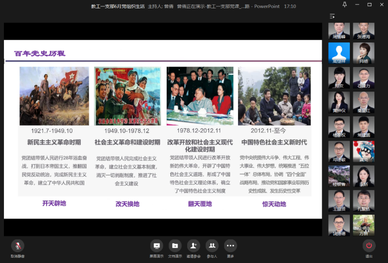 推动党史学习教育常态化制度化。教工一支部严格贯彻“三会一课”制度,开展教工党员上党课活动等。截止目前,共召开支部党组织生活12次,共有36名党员代表发言分享党史学习体会。支部上党史学习教育专题党课3次,分别由学院党委书记邓德敏同志讲《四渡赤水出奇兵》、支部书记曾倩同志讲《中国共产党百年探索之路》党课、支部纪检委员石建力同志讲《以史为鉴,开创未来》学习“七一”重要讲话专题党课。