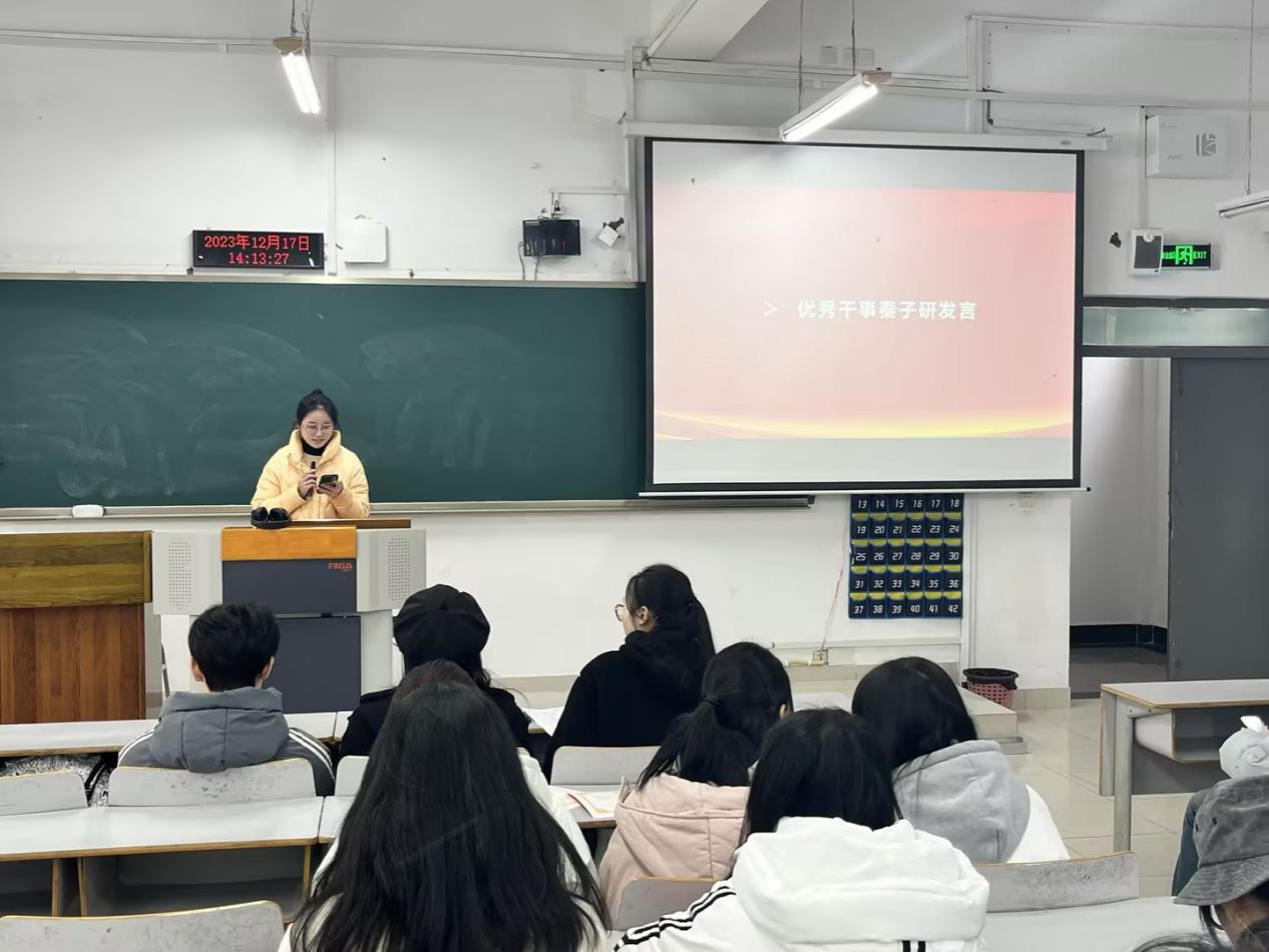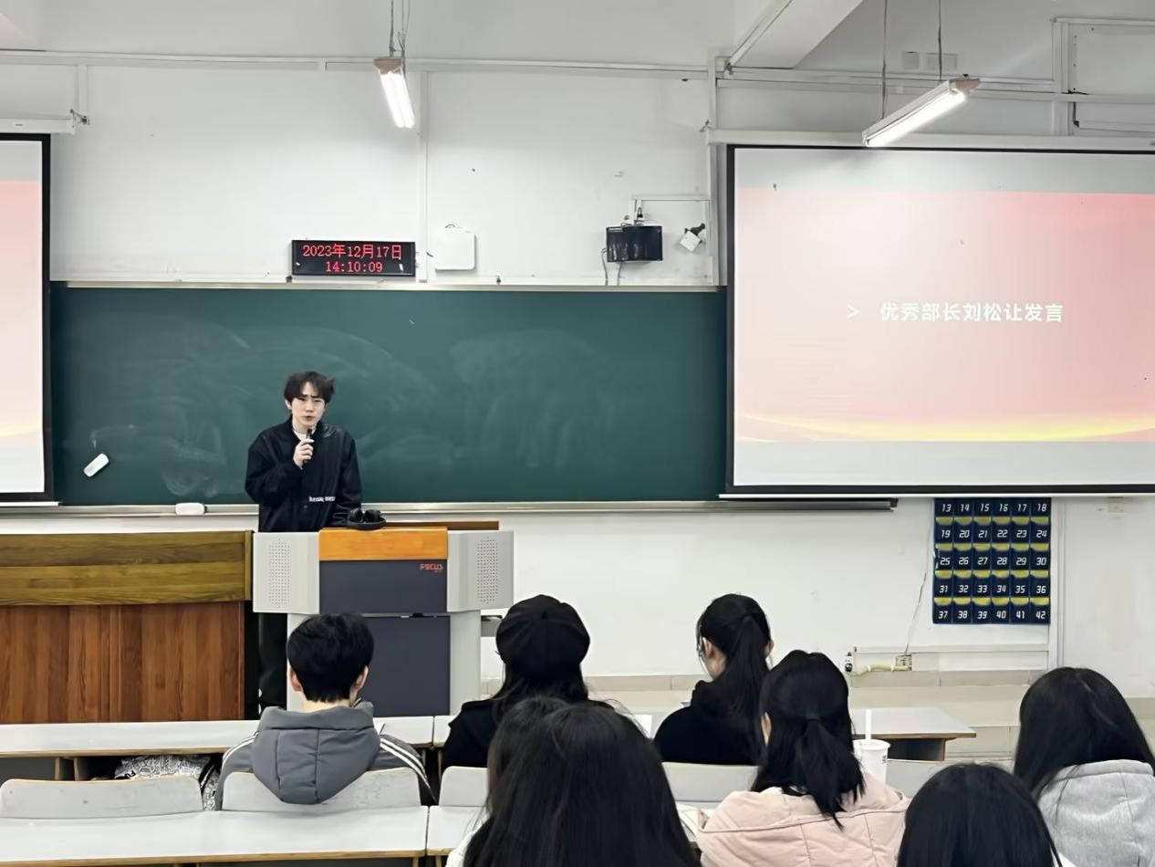 第三项议程:优秀代表发言。优秀学生助理代表邹林,优秀部长代表刘松让、董升达,优秀干事代表秦子研、程琪媛,均对这一学期的工作进行了总结,分享了自己在工作中的经验和心得,并勉励在场各位保持优良作风,延续优秀习惯。同时,完善自己的不足之处。
