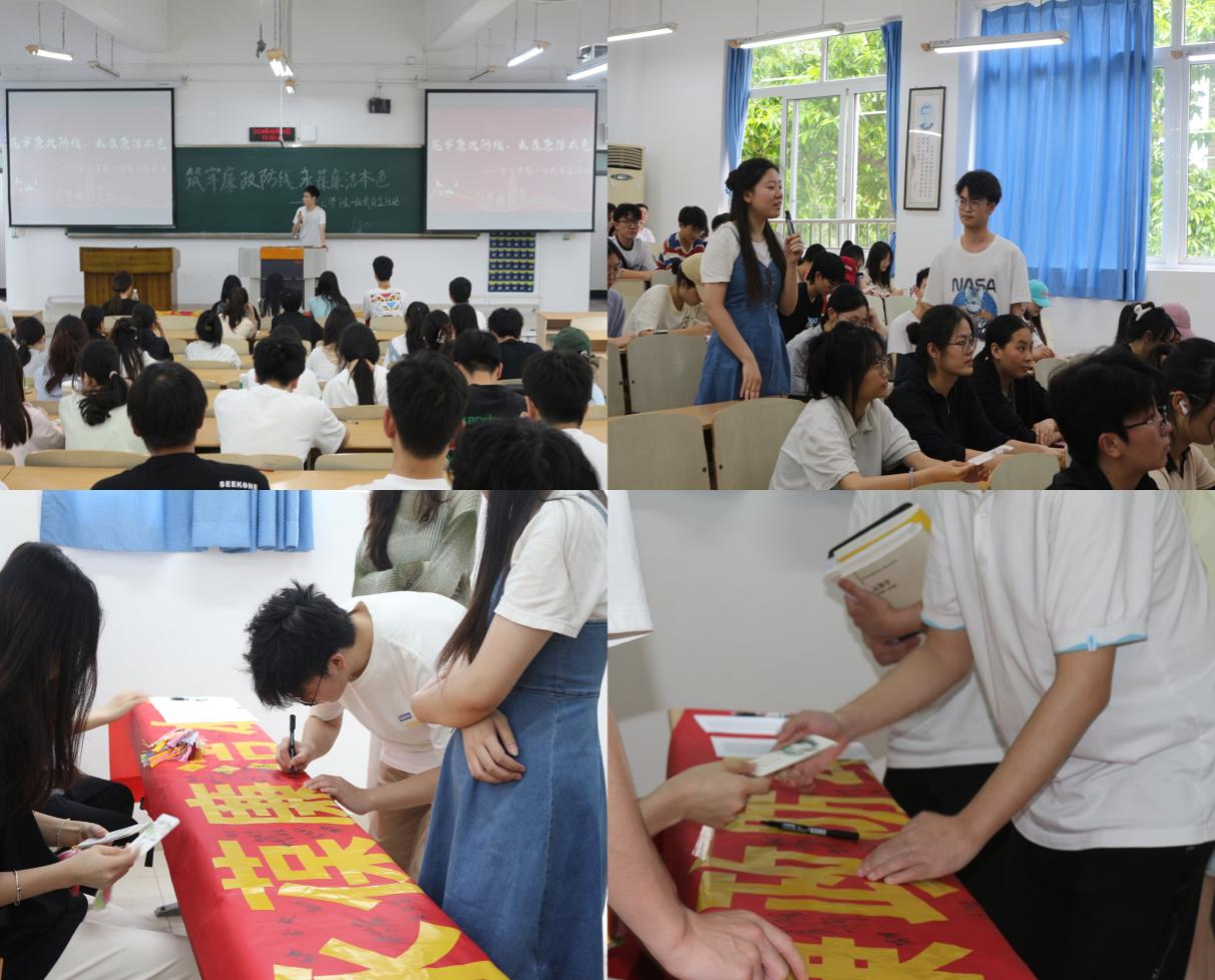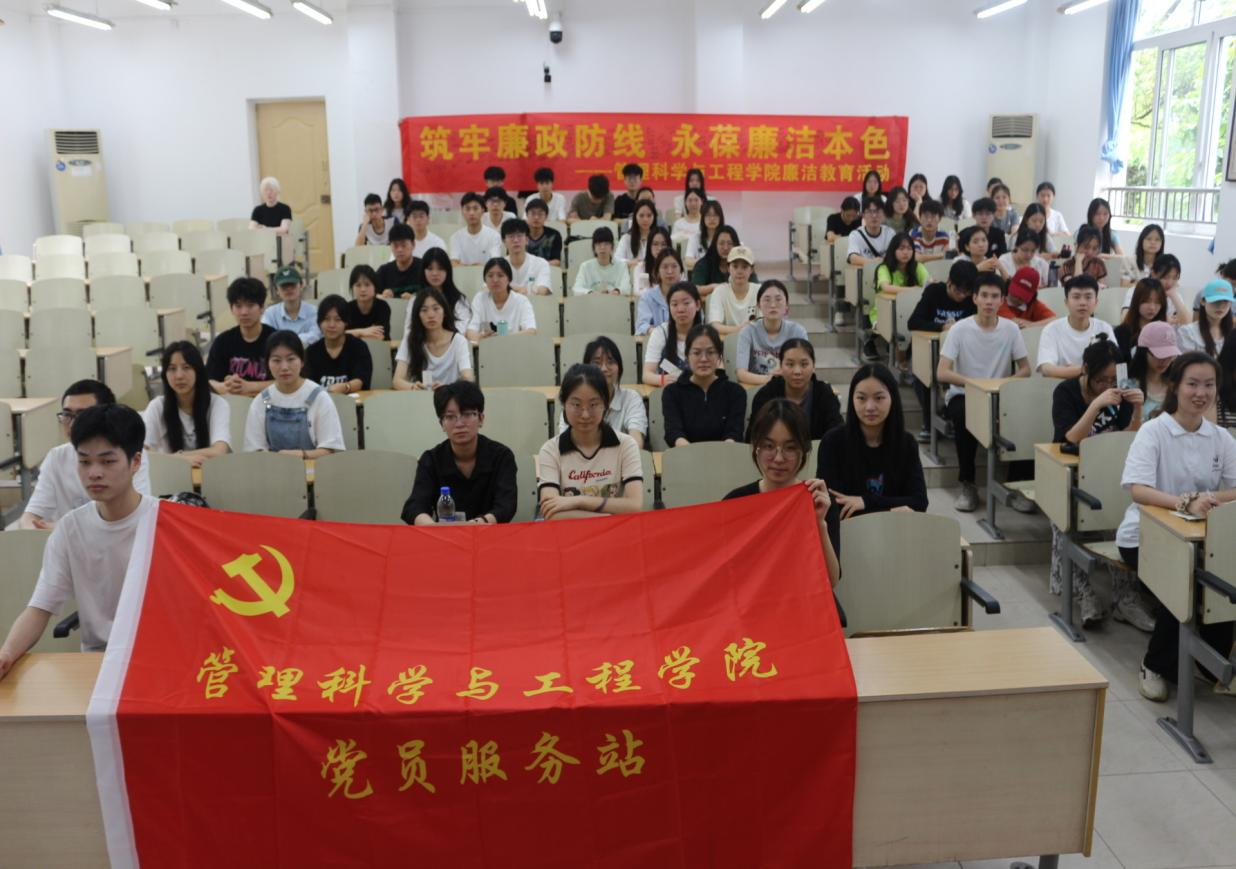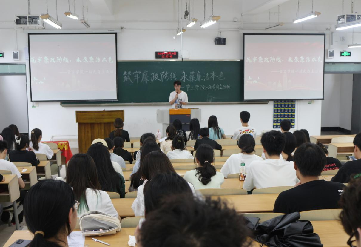 为深入推进党风廉政建设,营造风清气正的校园氛围,管工学院于2024年5月16日中午12:30在博智楼07206教室成功举办了“筑牢廉政防线,永葆廉洁本色”活动。此次活动通过微电影展示和横幅签名的方式,旨在引导同学们深刻认识廉政建设的重要性,形成对腐败现象的零容忍态度,并激发他们主动弘扬廉洁文化的热情,助力学院“一站式”学生社区建设。