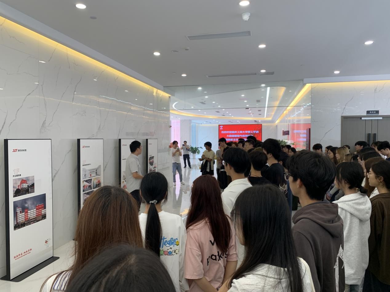 首先,在京东科技京东云事业部西南业务总监窦威锋的引导下,同学们参观了京东(重庆)数字经济展示中心。窦总监详细介绍了园区的光辉发展历程、高效运营模式以及在各领域取得的卓越成就。通过多媒体展示与案例讲解,同学们直观地了解了京东科技如何利用大数据、云计算等技术,助力重庆智慧城市建设、医疗健康服务升级以及产业数字化转型,零距离感受到了大数据技术赋能区域经济高质量发展中的关键作用。