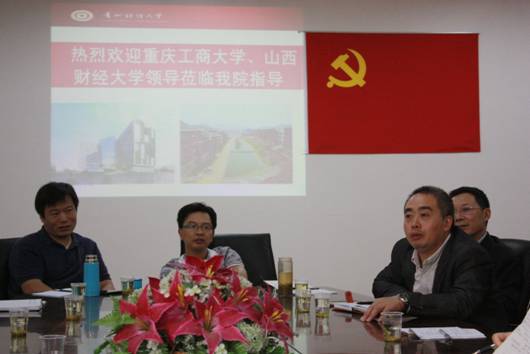 5月11日上午,骆院长一行来到贵州财经大学工商管理学院,与同时来访的山西财经大学工商学院一起,进行三方的交流。在听取了各学院的基本情况之后,骆院长也向贵州财经大学工商管理学院、山西财经大学工商学院的在座老师们介绍了我院的发展历史、人才培养、教师团队建设等方面的基本情况。接下来,三方的参会人员在教师团队建设、人才培养过程管理、专业实践环节等方面的展开了热烈的交流。特别是贵州财经大学工商管理学院所正在进行的教学范式改革经验引起了大家的特别关注。贵州财经大学工商管理学院的肖小虹院长、徐副院长介绍了他们在教学范式改革中目前正在进行的考试改革、试题库建设、以及课程改革的情况。工商系的袁开福主任则着重介绍了他们所开设“高峰体验课程”的经验——以学科竞赛为切入点,目的是实现学生大学期间所学专业知识的综合创新应用,将将老师讲授和指导学生实际参加竞赛项目结合为一门课程,并且在课堂上实现它。这对于注重学生科技创新活动,有“六大赛事”传统的商务策划学院而言,是一个有益的启示。