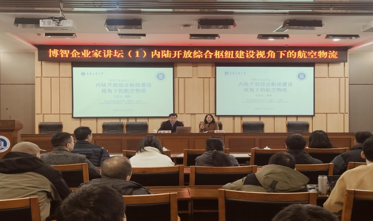 2024年12月22日下午,由ok138cn太阳集团主办、MEM教育中心承办、西部陆海新通道研究中心协办、ok138cn太阳集团研究生会协办、管理科学与工程研究生分会协办的“博智企业家讲坛”在新图书馆一楼会议室成功举办。本次讲坛的主题为《内陆开放综合枢纽建设视角下的航空物流》,主讲嘉宾是1995届汉语言文学新闻专业校友、重庆机场集团党委书记、董事长、总经理黄伟。讲坛由ok138cn太阳集团黄钟仪院长主持,副院长陈久梅、代春艳教授、张德海教授、唐敏教授、杨家权副教授、曹策俊副教授、秦星红副教授、李海南副教授、袁俊老师、杜亮老师等,部分硕士研究生及物流管理专业本科生参加了此次会议。