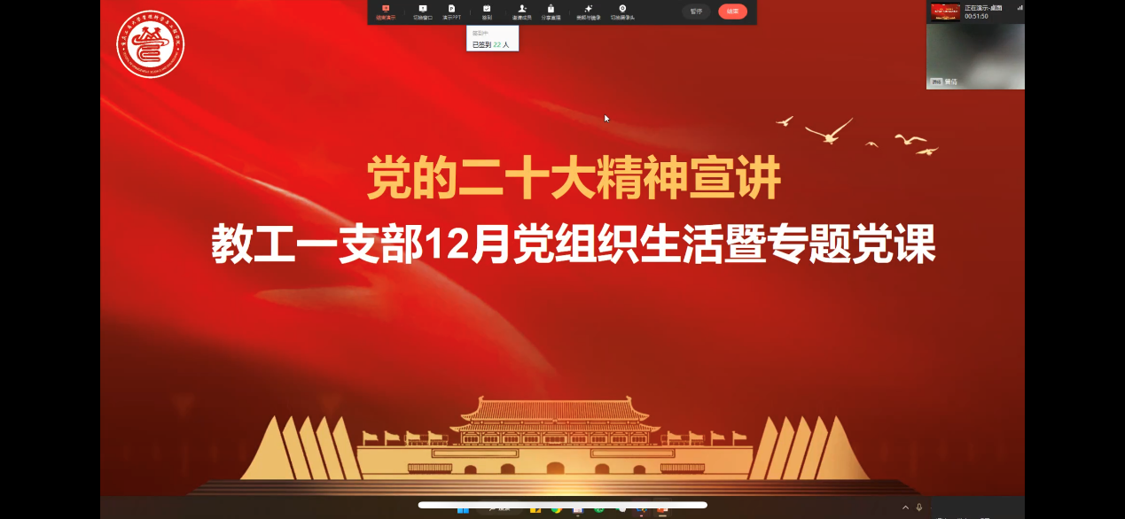 2022年12月30日下午2:00,ok138cn太阳集团教工一支部在企业微信直播召开12月党组织生活暨专题党课会议。本次会议由教工一支部书记曾倩同志主持,共设党员代表同志发言、支部书记讲党课宣讲二十大精神两项议程。