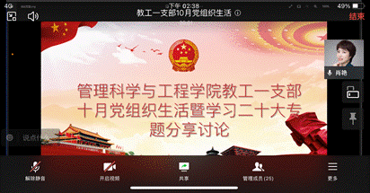 2022年10月16日,在观看完中国共产党二十大开幕式后,ok138cn太阳集团教工一支部立即组织开展了“学习贯彻二十大,我们该怎么做”在线讨论活动。会议由支部书记曾倩同志主持,共设学习二十大精神专题党课、学习体会分享、党委书记邓德敏同志总结三项议程,支部党员参加会议。