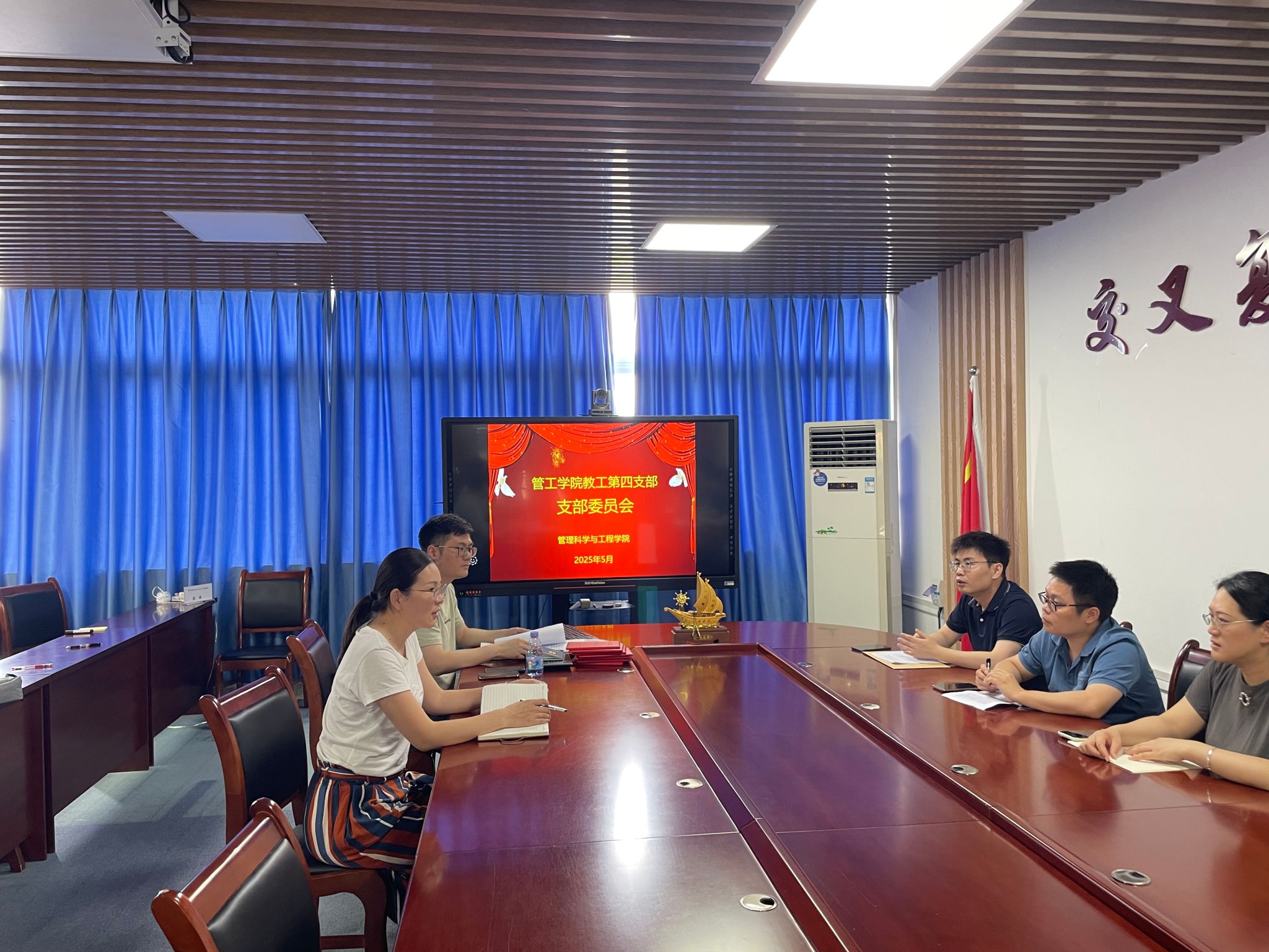 2025年5月30日中午12时,教工第四党支部在学院党员活动室召开了五月份支委会会议。本次会议由党支部书记邢文婷同志主持,旨在总结本学期迄今为止的支部工作,部署六月份工作任务,并就进一步加强支部建设、提高党建工作质量进行探讨。全体支部委员参加了本次会议。