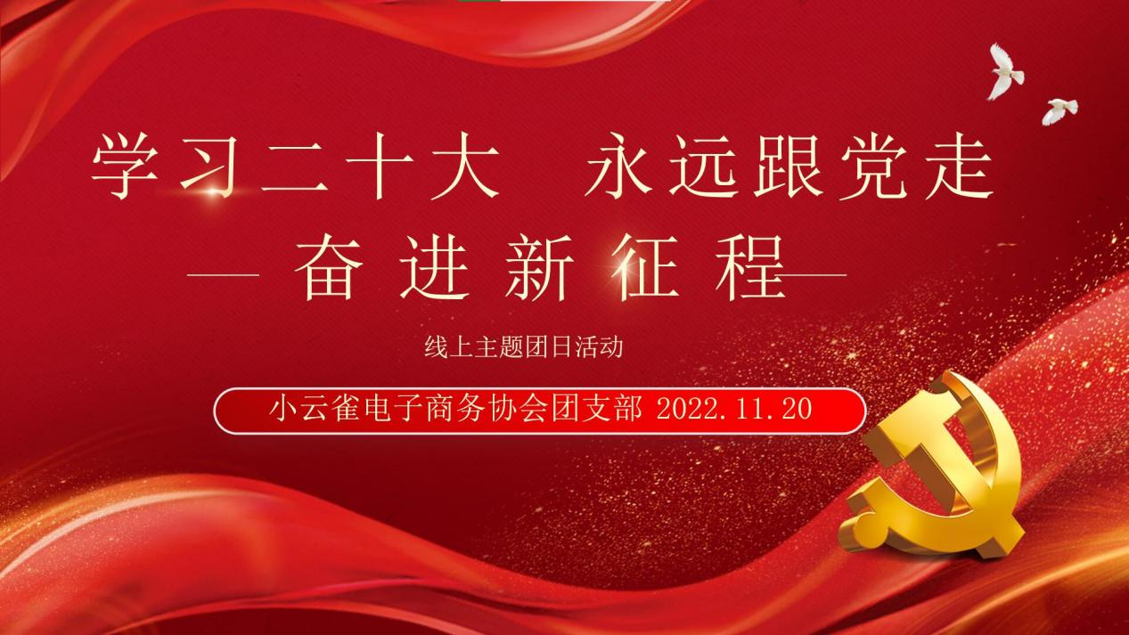 11月20日小云雀电子商务协会团支部通过线上形式举办“学习二十大,永远跟党走,奋进新征程”的主题团日活动。支部各成员在团支书的带领下,开展了共青团歌曲合唱,党的二十大视频学习,团员学习心得分享,党史问答、红歌竞猜,“青听青诉-中国故事”等系列活动。
