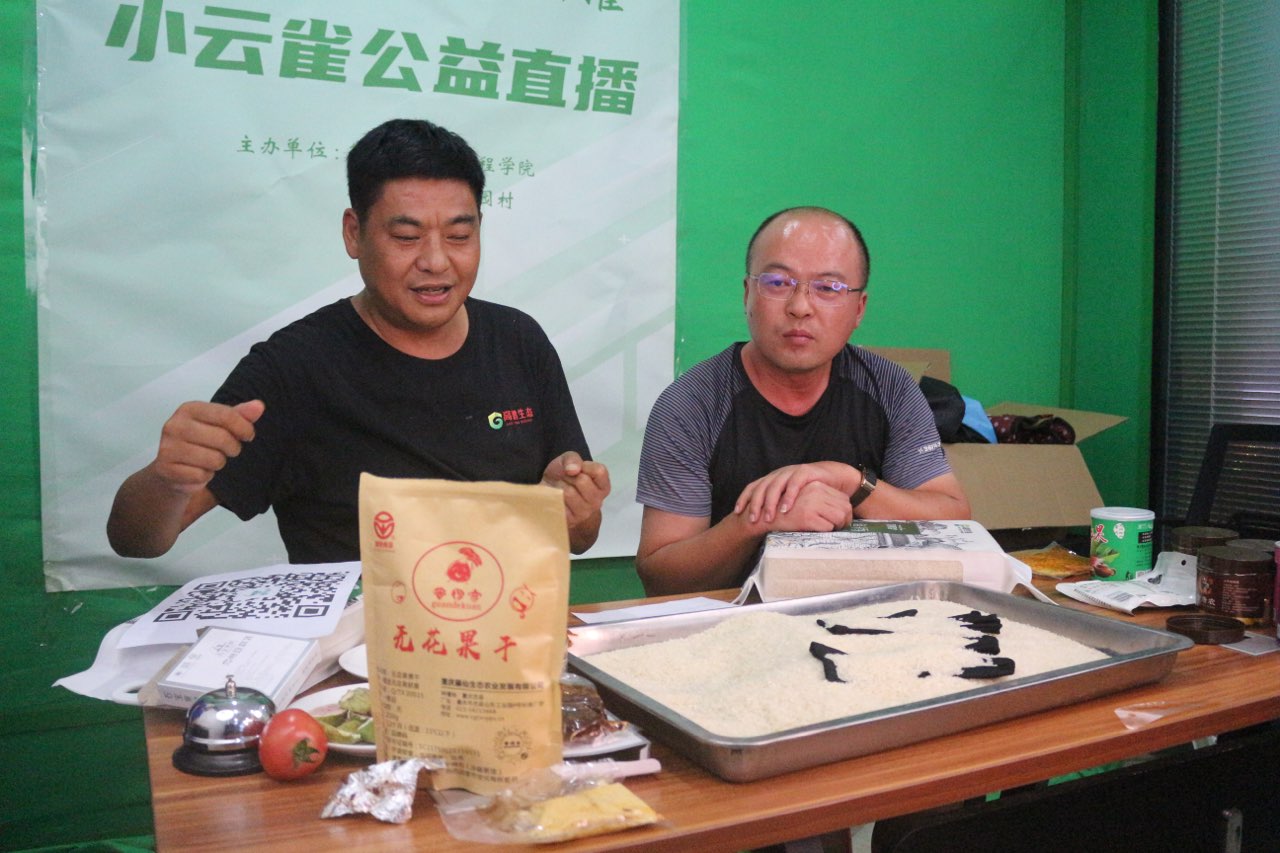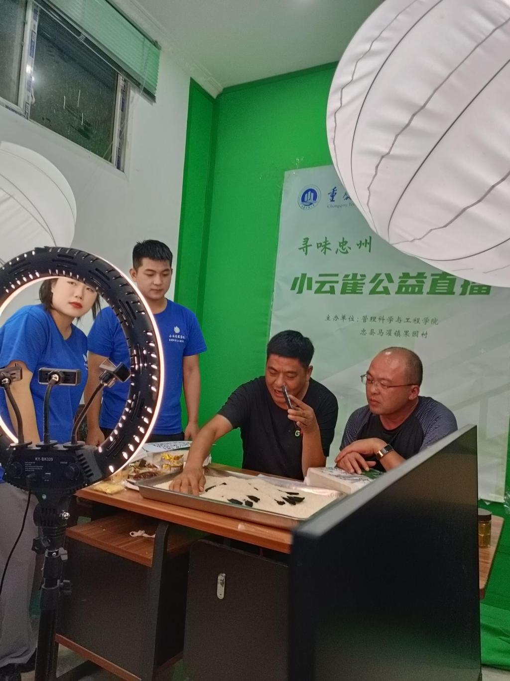 在田间地头的多次调研和直播方案的反复修改的基础上,7月7日,ok138cn太阳集团,太阳集团tyc9728,44118太阳成城集团小云雀服务队的大学生们精心准备的“寻味忠州,嗨购马灌”公益直播在忠县马灌镇果园村高鹏农业直播间开播。