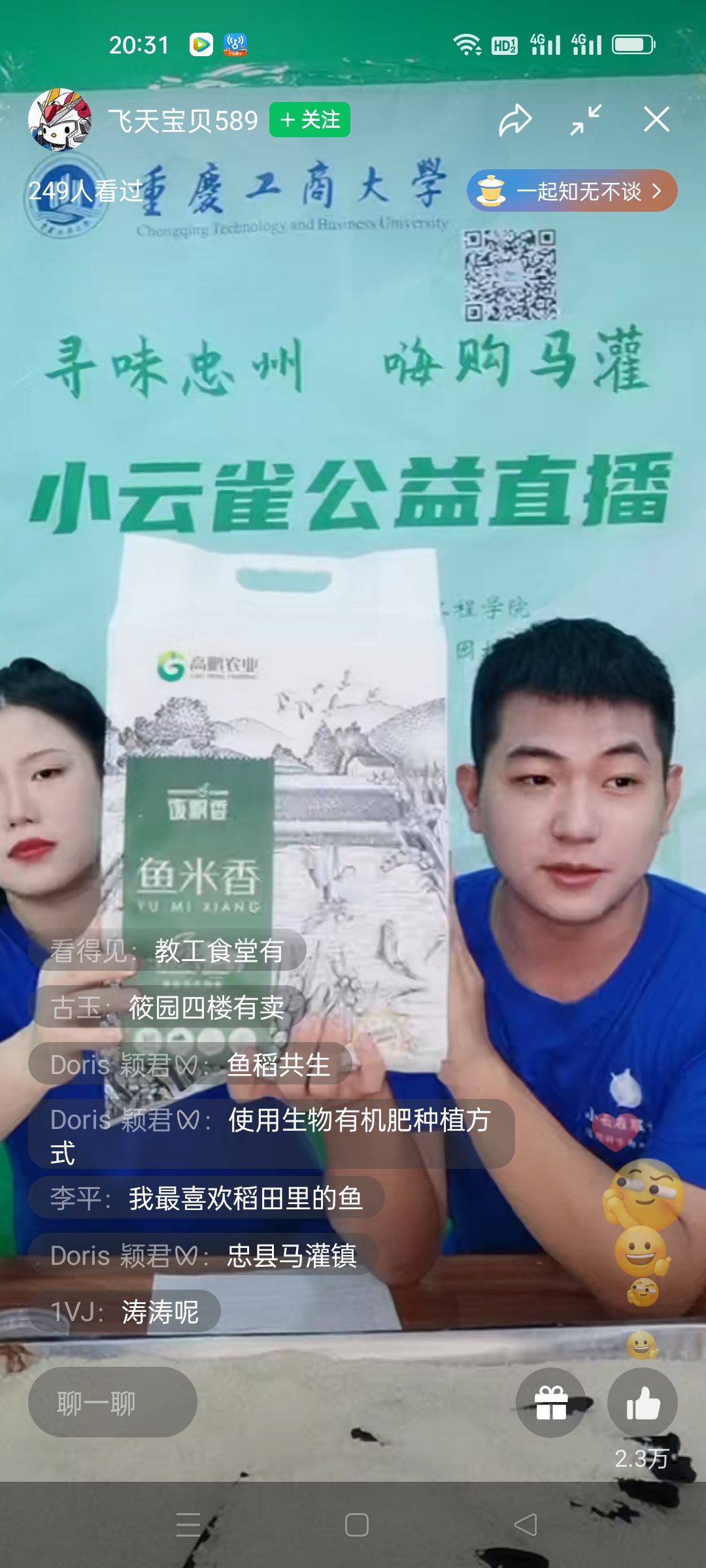 马灌镇果园村驻村书记杨徐勇和高鹏农业董事长周玉高也来到直播间,为大学生主播助力。杨书记为观众介绍了马灌镇果园村的基本情况,周玉高董事长讲解了“鱼米香”国家二级优质米“稻鱼共生”的培育生产过程。