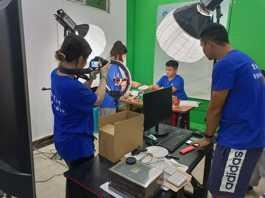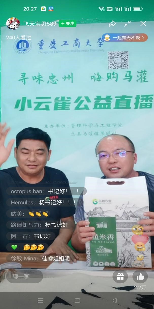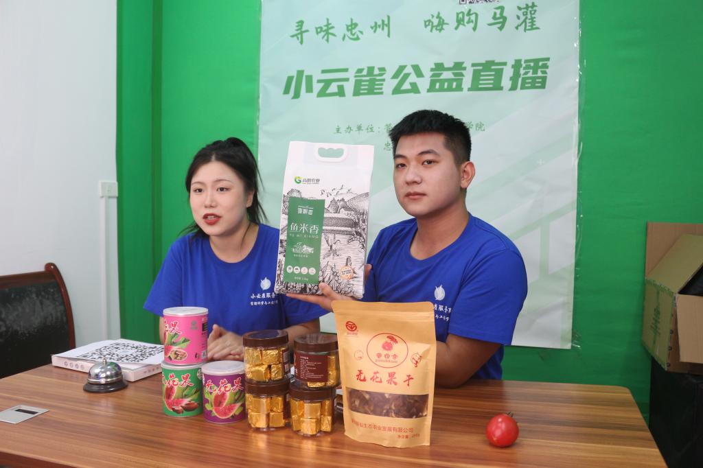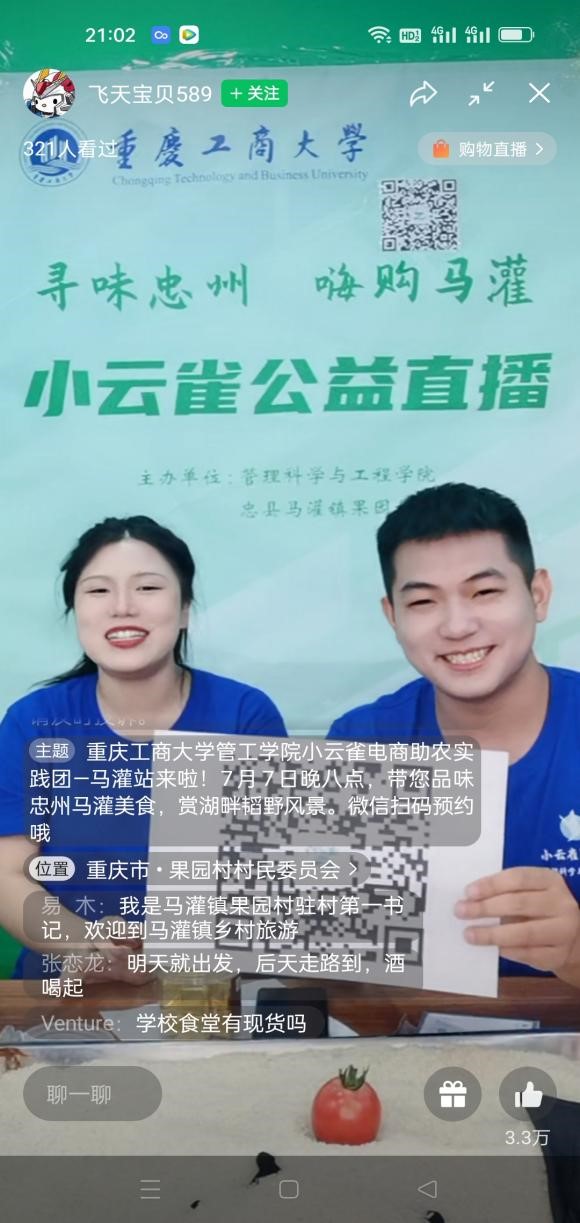 在田间地头的多次调研和直播方案的反复修改的基础上,7月7日,小云雀服务队的大学生们精心准备的“寻味忠州,嗨购马灌”公益直播在忠县马灌镇果园村高鹏农业直播间开播。大学生主播们幽默风趣、青春活泼。他们从产品生产过程、产品特点和产品食用方法等多个角度介绍忠县马灌镇农特产品,并极力推荐马灌镇重点打造的“灌湖水乡”公众号。马灌镇果园村驻村书记杨徐勇和高鹏农业董事长周玉高也来到直播间,为大学生主播助力。