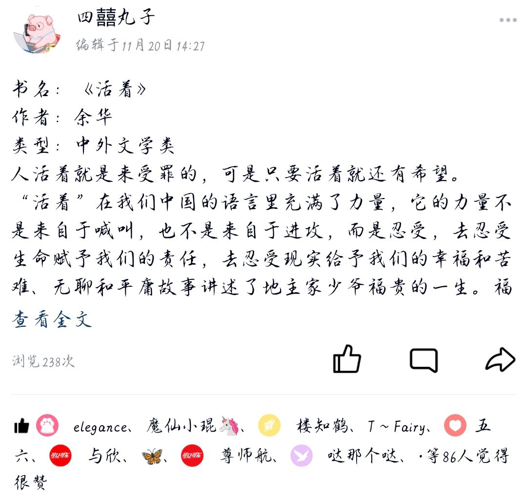 在活动过程中,各位同学的推荐词和感悟让大家对这些书又得到了更多的认识,其中22级新传二班罗芳推荐的余华的《活着》中写道,“活着”在我们中国的语言里充满了力量,它的力量不是来自于喊叫,也不是来自于进攻,而是忍受,去忍受生命赋予我们的责任,去忍受现实给予我们的幸福和苦难、无聊和平庸。这是《活着》的中心思想,亦是罗芳同学对生命的感悟。