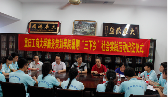 7月5日上午10:30商务策划学院在明德楼4020会议室举行暑期“三下乡”社会实践出征仪式。商务策划学院党总支书记邓德敏、院长骆东奇、学院党总支副书记叶海林、暑期“三下乡”社会实践团队全体成员参加了此次出征仪式。