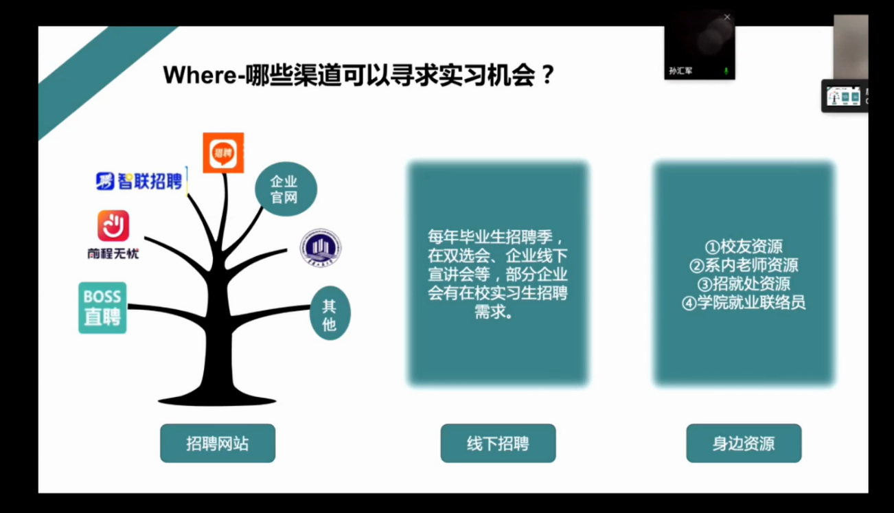 会议开始,肖艳老师就交流会主题及目的进行说明,并对梁桂保老师、牟斯颖学姐和孙汇军学长的到来表达了欢迎和感谢。随后,牟斯颖学姐从自身经历开始为大家分享简历与面试的攻略。其中,在简历攻略板块,牟斯颖学姐分享了简历制作的要点、简历的框架结构;在面试攻略板块,牟斯颖学姐从如何准备一分钟自我介绍、如何准备群面、评分要点以及HR面这四个方面为大家详细进行了阐述。接着,孙汇军学长则围绕“为什么要在毕业前工作实习?”、“什么时候实习?”、“哪些渠道可以寻求实习机会?”、“如何选择适合自己的实习单位/工作内容?”、“如何应对实习带来的机遇、挑战?”这五大板块展开交流,为同学们介绍了实习攻略和要求。