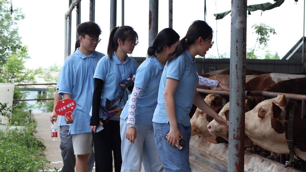 在牛场负责人秦贵忠等人的带领下,小云雀服务队实地参观了养殖场、有机草田等地,详细了解了牛场农业生产、加工、销售等各个环节。队员们与牛场工作人员进行访谈,了解种养循环的养殖全过程和牛场负责人的创业故事。