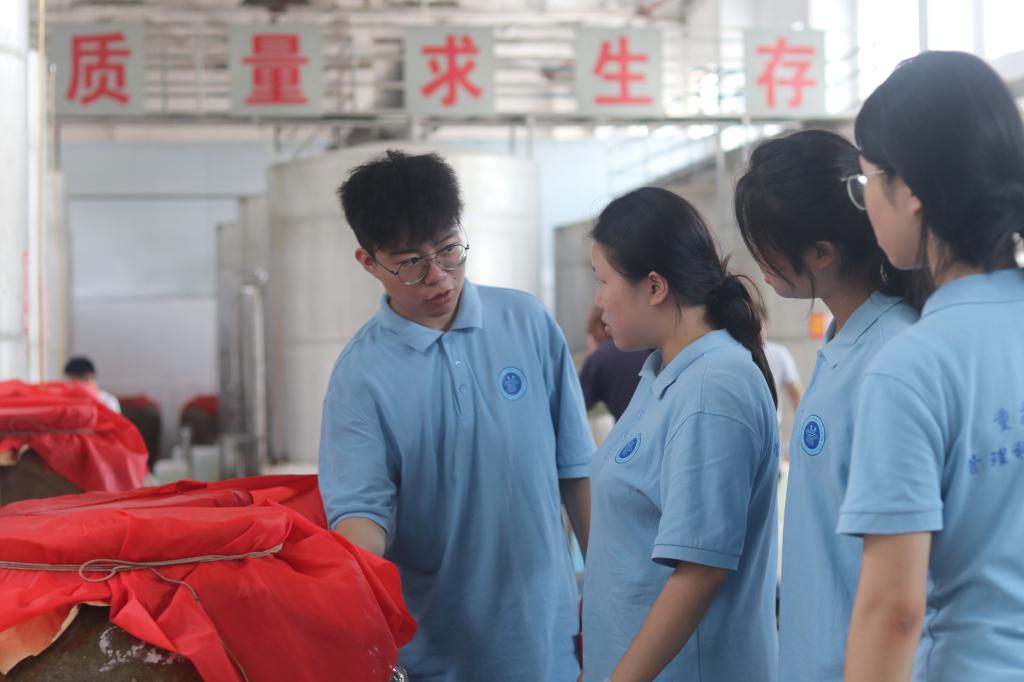 在乌杨酒厂总经理牟小琼、厂长何春华的带领下,小云雀服务队师生与太阳集团tyc9728环境与生物学院师生一起参观了乌杨酒厂的生产车间。厂长何春华详细介绍了乌杨酒厂的发展历史、产业布局、主要产品、乌杨酒的酿造工艺和过程。乌杨白酒产出于重庆市忠县乌杨,采用优质的糯高粱为原料,引山泉水,采用的是传统的固体小曲酒酿造工艺“泡、闷、蒸、糠、水、温、匀、透、适”酿制而成,具有“饮后不刺喉、不伤头、回味爽、余香久”的独特风格。2013年,乌杨白酒制作技艺被列入重庆市第四批非物质文化遗产代表性项目名录。