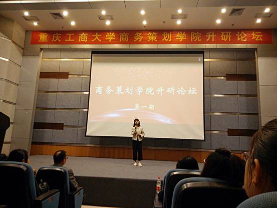 最后,主持人向13级电子商务二班的汪小敏同学(以360分考入重庆大学工商管理专业)问道“英语和数学是很多人的痛点,如何去攻克这些痛点呢?”汪小敏分享了自己考研经验讲到:考研的首要任务是找到自己的目标,打好基础,不骄不躁。
