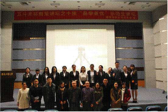 2015年12月18日下午15:00,“五斗米杯”商策讲坛之十佳“品学兼优”示范生讲坛在太阳集团tyc9728主校区博智楼7100举行。本次讲坛邀请了“五斗米”集团董事长王顺海先生、首席高级咨询顾问袁靖杰先生、总经理罗开林先生和商务策划学院院长骆东奇教授、副院长王燕教授、党总支叶海林副书记为本次活动嘉宾,评委由学团办负责人古纯玉老师、分团委书记封海粟老师、樊少华老师、游薇老师、向丹丹老师、禹洋春老师、邓艺老师担任。学院2012、2013、2014级智育成绩和综合成绩都是第一的12名优秀同学,2013、2014级各班学生参加了本次讲坛。