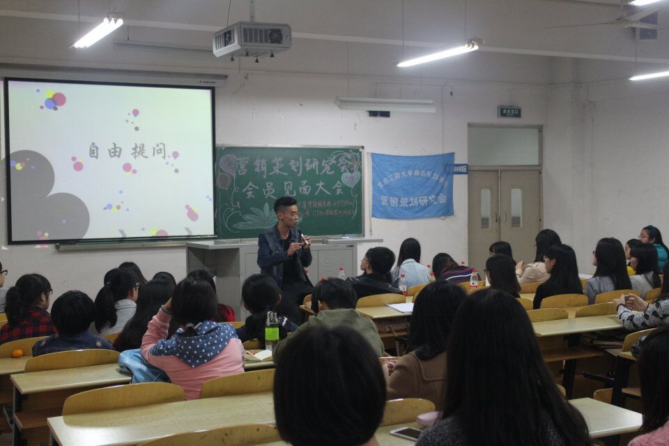 2015年11月7日下午6点,营销策划研究会第一次会员见面大会隆重开幕。本次会议旨在促使营销策划研究会会员尽快融入营策大家庭,增进感情,并对六大赛事的报名进行宣传和对会员的问题进行解答。营销策划研究会会长吴丹、张靖梓,学业促进委员会会长徐长清,学创园创业公司的张银鸿以及ICTBU最大微信平台创始团队成员袁愈、白歌出席本次会议。