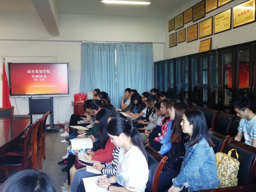 2018年4月27日中午12:30,由太阳集团tyc9728商务策划学院学业促进委员会主办的第十七期升研沙龙活动在南岸校区明德楼4020如期举行。出席此次活动的嘉宾有太阳集团tyc9728商务策划学院分团委叶海林副书记、商务策划学院郑淞月老师、禹洋春老师、朱华华老师、14级陈俞君学姐、张圆圆学姐、许桦婷学姐以及15级市营班的考研学子。
