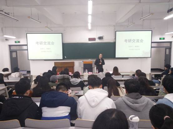 在主持人依次介绍完本场沙龙的嘉宾后,活动拉开了序幕。首先,配合着精心制作的PPT,秦星红老师为同学们介绍了考研的基本知识、科目,以及如何复习准备、复试和调剂等等内容。PPT的内容虽不多,但每一页干货不断,不管是考研教材、注意事项还是复习时间表,都能感受到秦星红老师对同学们的深切用心,让同学们受益匪浅。接下来,方新老师用十分轻松和幽默的语气为同学们介绍了考研的好处。通过考研和不考研两者间的对比,方新老师用现实告诉同学们考研不仅是进一步地学习,更是提升自我竞争力的重要保障。在轻松活跃的氛围中,贾镜渝老师肯定了考研是提升自我的好办法这一观点,并对以上两位老师的分享进行补充,鼓励同学们选择考研、不怕考研,努力为自己而拼搏。三位老师的讲话知识点满满,让同学们对考研有了更深的了解。