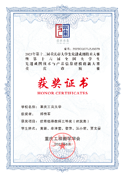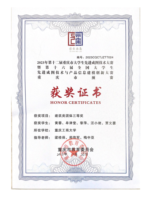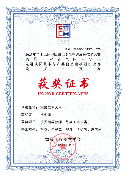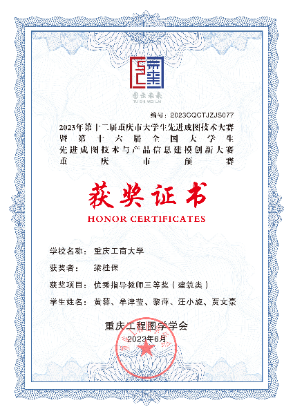 2023年5月26日至27日,第十六届全国大学生先进成图技术与产品信息建模创新大赛(以下简称“成图大赛”)重庆市预赛暨第十二届重庆市大学生先进成图大赛在重庆建筑工程职业学院举行。ok138cn太阳集团,太阳集团tyc9728,44118太阳成城集团工程管理系梁桂保副教授、郑传军博士、梅中亚博士带领7名工程管理本科生在本次大赛中荣获建筑类团体三等奖。