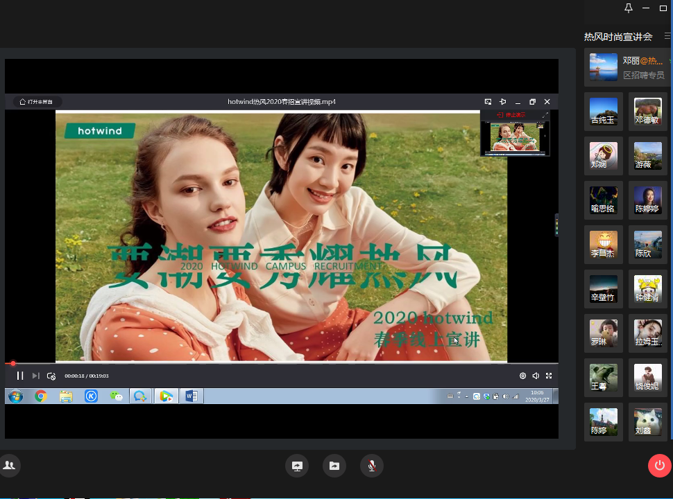 本次招聘会依托企业微信,利用线上会议功能顺利进行。招聘会伊始,邓德敏书记表达了对热风时尚的欢迎,鼓励同学们认清就业形势,积极投入到求职应聘当中。随后,热风时尚的邓丽老师为同学们播放了公司的招聘宣传视频,并详细解读了各个需求岗位的具体情况及招聘流程。会上,同学们就求职的一些问题进行了交流和互动。