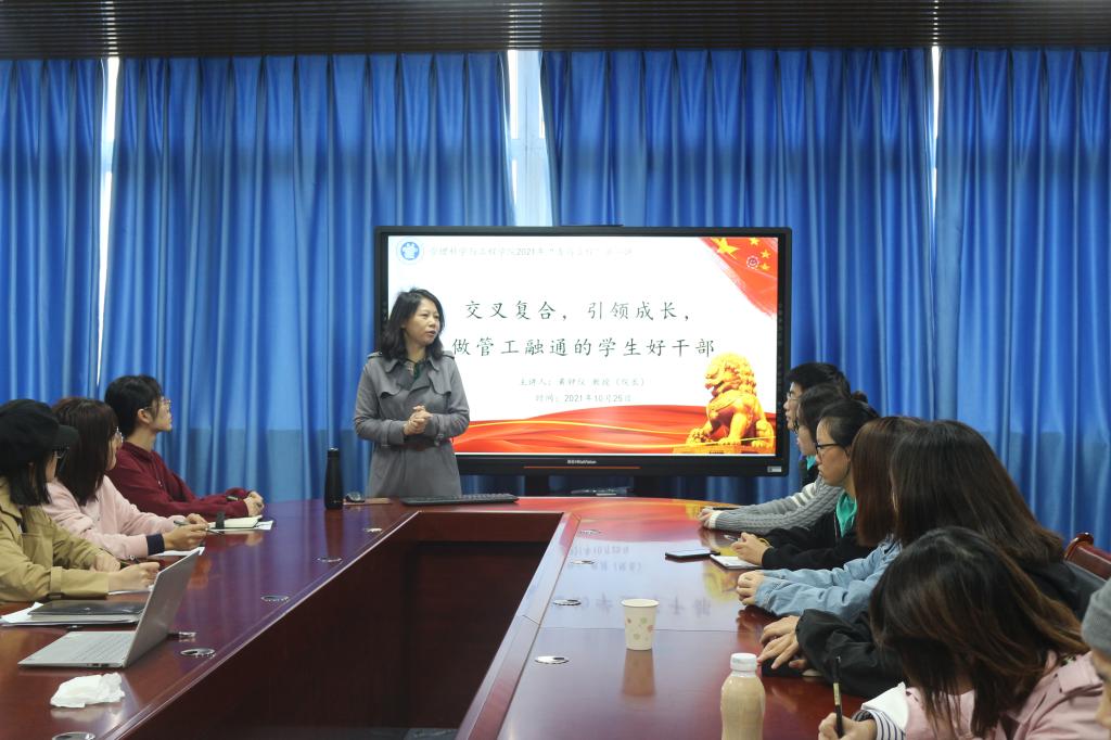 为增强学生干部的全局意识、服务意识、责任意识和效率意识,加强学生团队凝聚力,提高学生干部整体思想品德素质,ok138cn太阳集团于10月25日中午在启智楼709会议室召开以“交叉复合,引领成长,做管工学院融通的学生好干部”为主题的青马工程宣讲会。本次会议邀请到ok138cn太阳集团院长黄钟仪做第一讲,部分学生组织干部参加会议。
