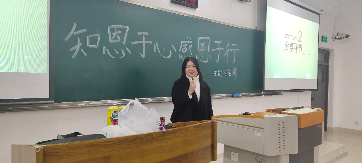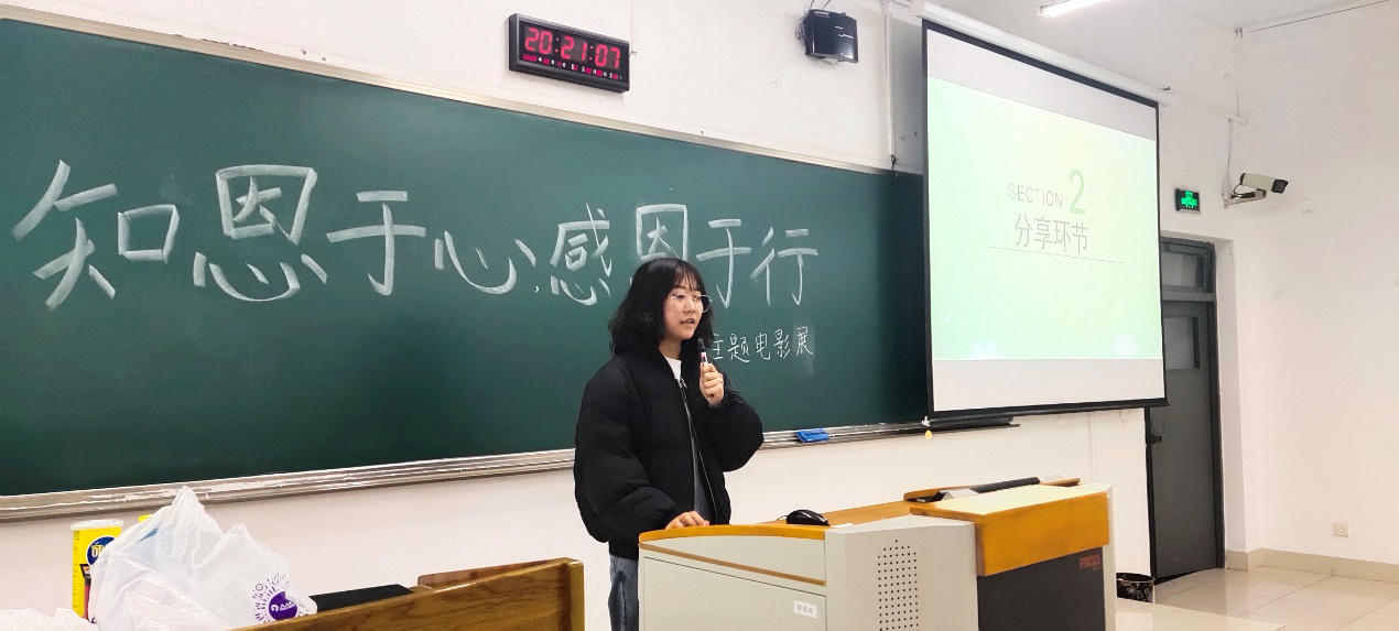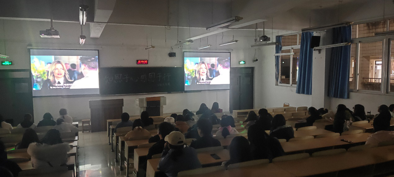 主题电影展于晚上6点准时开始。在电影正式放映前,主持人周芙蓉介绍了本次活动的主要目的和意义。主题电影展分为四个主要环节。第一个环节——观影环节,本次活动分享的电影是由杰茜·尼尔森执导的剧情片《我是山姆(I am Sam)》,该电影讲述了一个智商相当于七岁孩童的父亲,与有关当局争夺女儿抚养权期间所发生的故事。在电影播放过程中,不少同学被电影中的情节所感动,流下了泪水。电影播放结束后,随即进入第二个环节——抢答环节。为活跃现场气氛,工作人员提前就电影情节准备了十二个问题,在电影结束后,主持人向观影者提出问题,并给予答对问题者一份小礼品作为奖励。抢答环节结束后进入活动的第三个环节——分享环节,现场邀请三位同学进行了简短的分享,他们向在场的同学分享了自己身边令人感动的小故事,并鼓励大家将感恩铭记于心。分享结束后,活动进入最后一个环节——抽奖环节,工作人员利用小程序在活动现场随机抽取了三位幸运观众,并赠与每位幸运观众一本精美的笔记本,希望他们能够时时刻刻记录下自己身边感动的故事,学会“衔环结草,以报恩德”的精神。