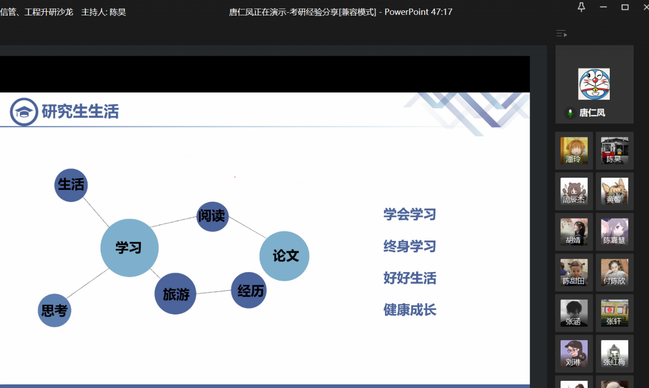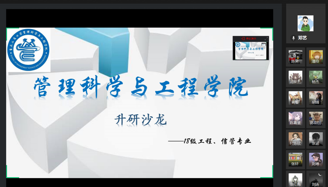 本次沙龙将在信管、工程考研的同学中搭建起一个学习交流升研经验和技巧的平台,激发同学们考研的信心和热情。大三正处于抉择的关键时期,而优秀校友的考研分享,也为18信管、工程的学子们点亮了未来的路灯,使考研学习坚定了信心、明确了方向。