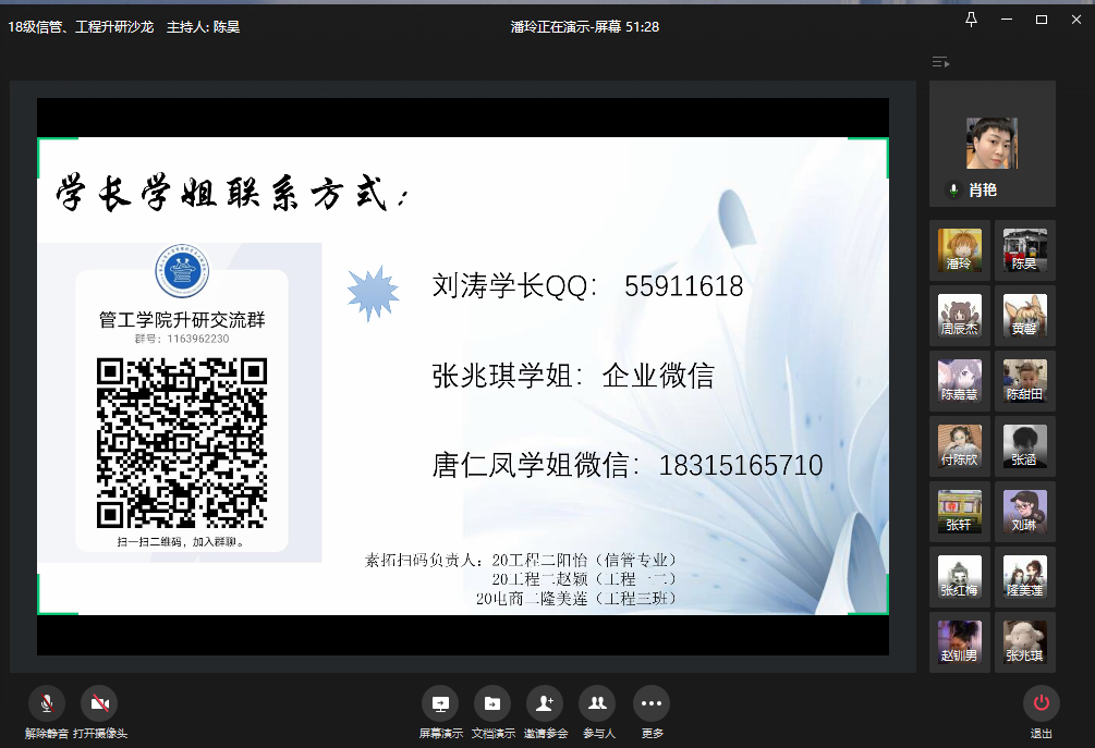 2020年12月3日下午12:40,我院于企业微信举行了18级信管、工程升研沙龙。我院分党委副书记陈春洁、工程管理系主任肖艳、辅导员邓艺参与本次活动。升研自16级信管、工管专业的学长学姐、优秀校友——现就读于本校企业管理专业的张兆琪、云南大学的刘涛、华中师范大学的唐仁凤,为我院17信息管理和工程管理专业学子,分享升研技巧和经验。本次升研沙龙,分享、聆听和学习的在线人数多达120余人。