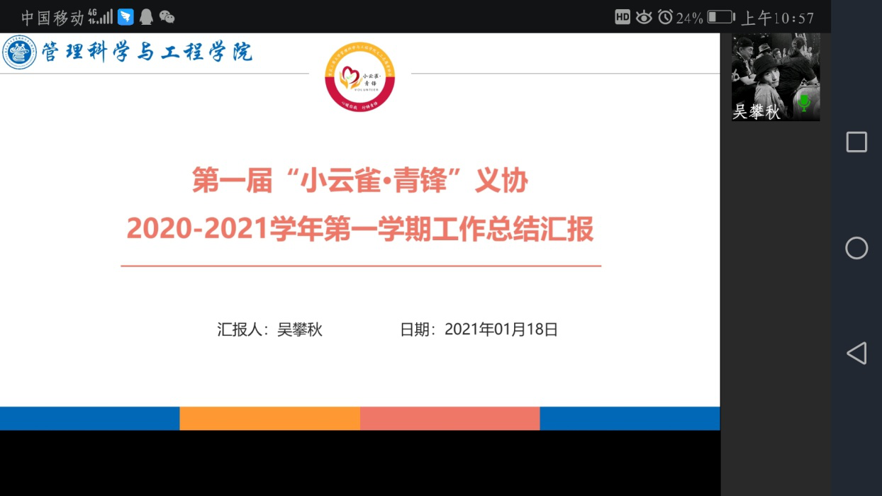 会上,学院各学生组织主席团成员代表纷纷对2020年度的工作进行了PPT总结汇报,结合工作中存在的问题,提出了整改措施。同时,针对学院十四五团学工作的开展也提出了自己的见解和建议。学生组织各部门负责人也积极发言,分享了自己在工作中的收获和感悟,对未来团学工作的开展,学生组织的发展提出自己的看法。
