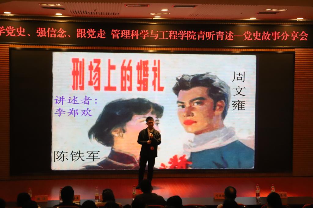 分享会上,学院师生用表演、朗诵和讲述等丰富多彩的形式再现了党史上的英雄人物和感人故事。邓艺、曾倩两名教师党员饱含深情地演绎了陈觉和赵云霄这对革命夫妻的家书,学生党员周允虹、杜彦敏分享了焦裕禄、陈望道的故事,青年团员李郑欢用表演加讲述的方式再现了刑场上的婚礼。“焦裕禄、陈望道、赵一曼、杜永瘦、程开甲、刘胡兰、陈觉……”,一个个共产党人始终坚定信念、为革命理想不怕牺牲、甘于奉献的精神令在场的每一位观众为之动容。选手们的深情讲述给予现场每一位听者以精神洗礼,一个个党史故事激励着他们坚定信念,铆足干劲,为梦想与未来不断奋斗进取。
