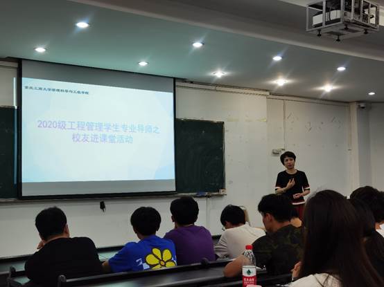 为了加强20级工程管理专业学生对人才培养方向的认知,明确未来职业生涯规划,2021年5月12日晚,2020-2021学年第二学期专业导师活动之“优秀校友进课堂”在江北校区逸智楼A311教室顺利举办。本次活动由专业导师肖艳、王子娟老师主持,邀请到2016级工程管理优秀校友杨航作为主讲嘉宾。参加本次活动的学生共130人。