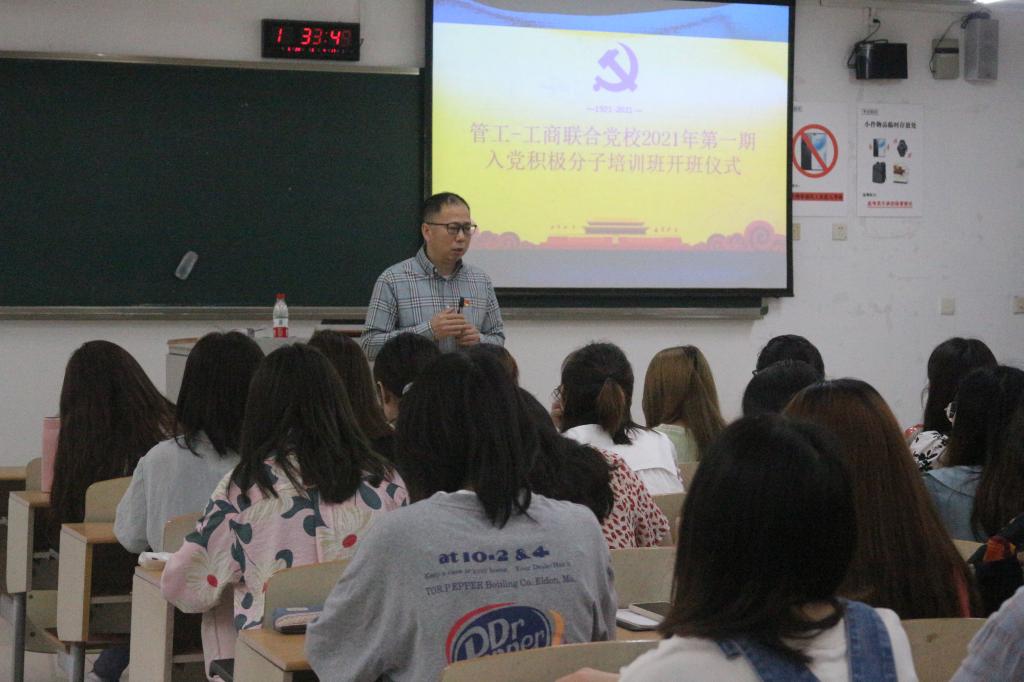 为了教育引导广大入党积极分子学习党的基本知识,了解党的基本路线和基本纲领,大力发扬红色传统、传承红色基因,以积极昂扬姿态迎接建党百年,2021年5月29日,由ok138cn太阳集团和工商管理学院联合党校举办的2021年第一期入党积极分子培训班在博智楼07205教室正式开班。太阳集团tyc9728党委统战部常务副部长陈松、ok138cn太阳集团分党委书记邓德敏、ok138cn太阳集团专职组织员叶海林参加了本次开班仪式并进行授课,80余名入党积极分子参加了此次培训。