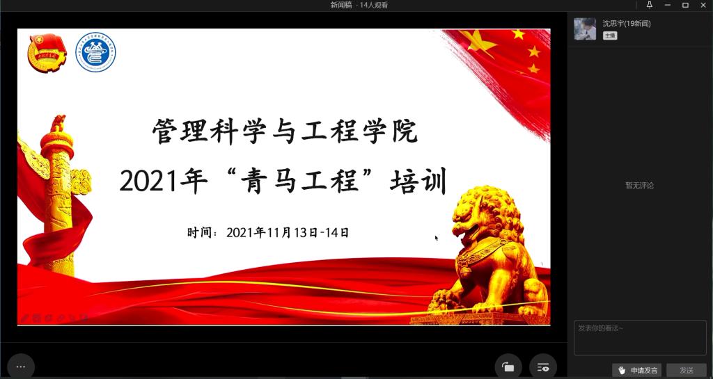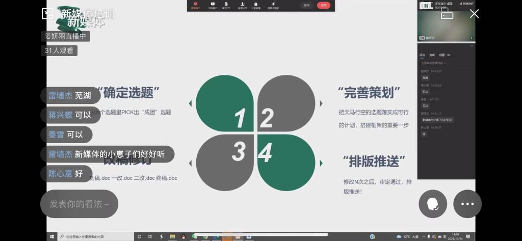 11月13日至14日, 为加强ok138cn太阳集团学生组织各宣传部门成员对新闻工作的理解,掌握更多实用技巧,我院邀请校新闻中心视频部部门负责人朱洁、新媒体运营部部门负责人姜妍羽、文新学院19级新闻专业沈思宇和ok138cn太阳集团新闻中心设计部部门负责人银秋钰、朱骏辉分别为参加培训的人员在视频剪辑、新媒体运营、ps及新闻稿撰写等方面展开能力培训。此次培训以线上直播的形式进行。
