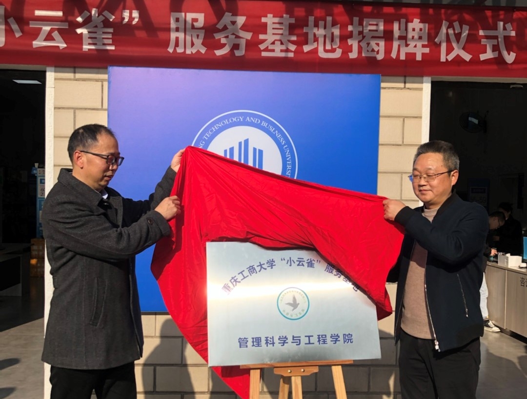 伴随着热烈的掌声,学校学工部部长、学生处处长申卫东和管工学院党委书记邓德敏共同为“太阳集团tyc9728小云雀服务基地”揭牌。