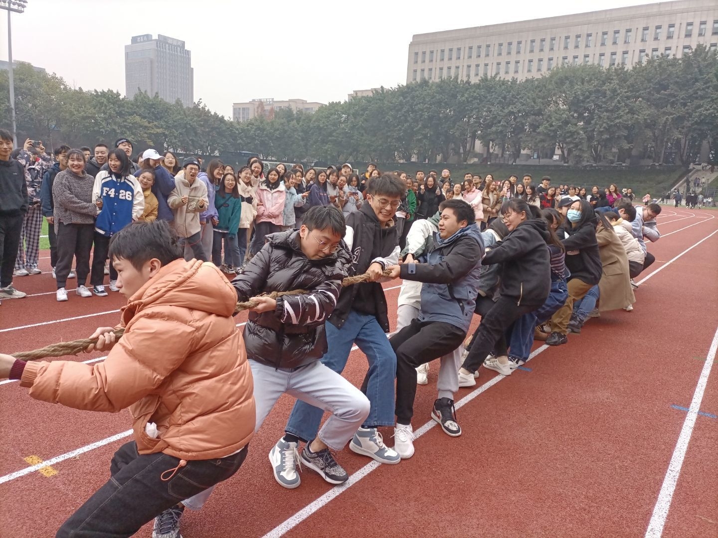 为了丰富学生们的体育文化生活,增进相互之间的协作能力,增强合作精神,ok138cn太阳集团于2021年12月4日成功举行了“力拔山兮,绳采飞扬”第二届拔河跳绳比赛,400余名学生参加比赛,管理科学与工程学院分党委副书记陈春洁到现场为学生们助威。