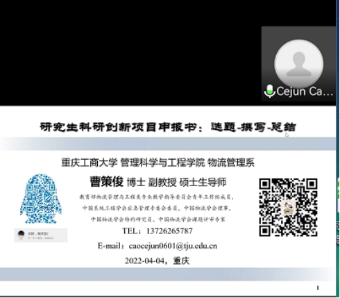 为加强我院研究生科研创新能力培养,鼓励在校研究生积极承担创新性研究课题,提高研究生培养质量。2022年4月6日上午10点,管工学院邀请物流管理系曹策俊博士在线上为研究生指导申报《2022年市级、校级研究生创新项目》讲座。管工学院研究生全员参加。