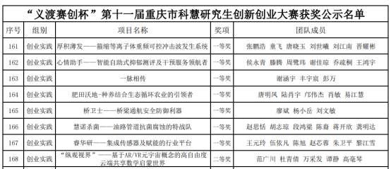 近日,由重庆市教育委员会主办,重庆大学研究生院承办的“义渡赛创杯”第十一届重庆市科慧研究生创新创业大赛公示了获奖名单,我院李川和白云老师指导2020级研究生王元玲、伍依凡、陈旭等成员主持的项目“睿华研——集成传感器及赋能的行业平台”获得创业实践组一等奖。