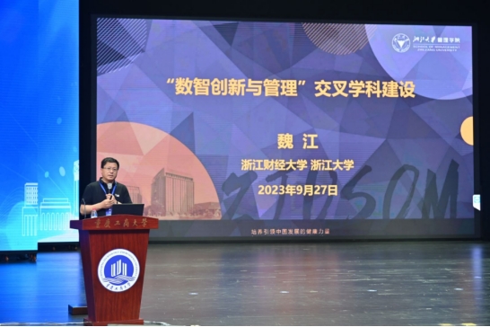 浙江财经大学魏江教授发表了题为“数智创新与管理交叉学科建设”的主题报告。他指出,智能增强时代正在加速到来,人与人之间的关系、人与机器之间的关系等正在被重新界定,这将超越传统管理、工程等学科的边界,亟需新型交叉学科来对新时代的生产力和生产关系新规律进行探索。魏江教授介绍了浙江大学管理学院对“数智创新与管理”交叉学科的建设举措,旨在打破学科壁垒,引领全球数字智能创新和管理研究范式。建议中国商学院应注重将教学内容与本土情境相结合,在教学内容中融入现代科技如人工智能、大数据、万物互联下的组织管理知识,培养学生的分析能力与创造力,在研究中启发新的思考,产出反哺社会的新的理论成果。