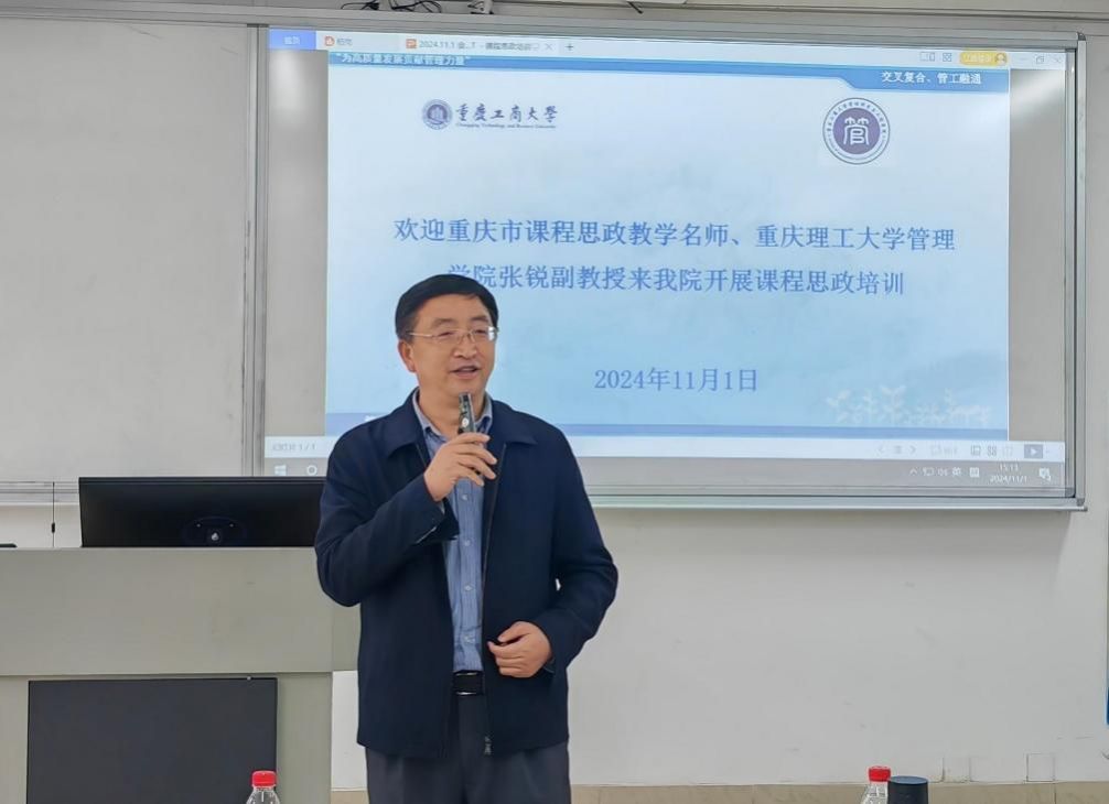 2024年11月1日下午,学院邀请重庆市课程思政教学名师,重庆理工大学管理学院张锐副教授,硕士研究生导师,北京大学艺术学院访问学者来院分享“课程思政”。此次培训旨在通过理论讲解与实践分享,帮助教师更好地理解课程思政的内涵与要求,提升教学质量与效果。学院领导班子、系主任及全体任课教师参会。培训会议由梁桂保副院长主持。