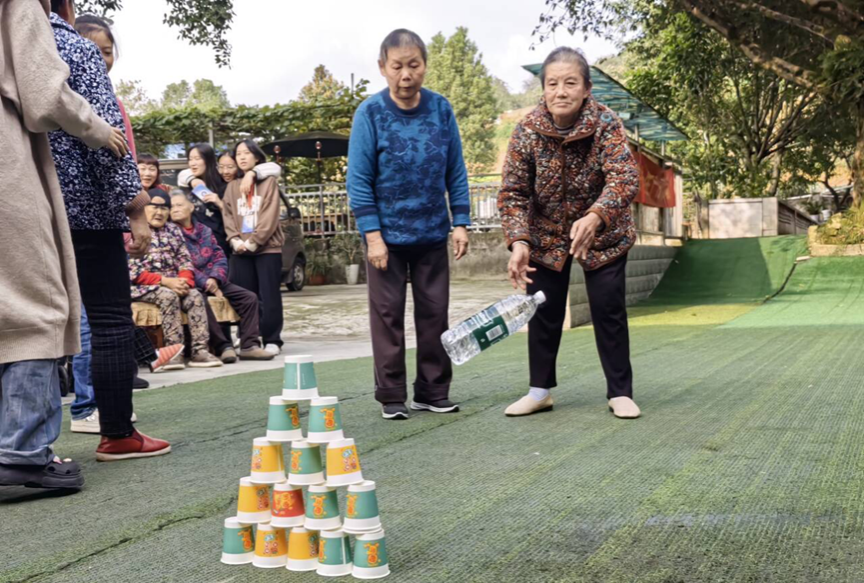 随后,活动进展到互动环节,许多老人上台展示自己的才艺,有经典歌曲《东方红》《回娘家》等经典老歌。接下来的健身操《八段锦》更是调动了老人们参与互动的积极性,在健身操表演期间多位老人上台一同学习健身操,强筋健骨,锻炼身体。在此环节之后,便迎来了游戏环节, 分别为弹乒乓球与模拟保龄球两个游戏,在志愿者的陪同下,老人们踊跃参加,现场一片和乐,老人们与志愿者们打成一片,其乐融融。