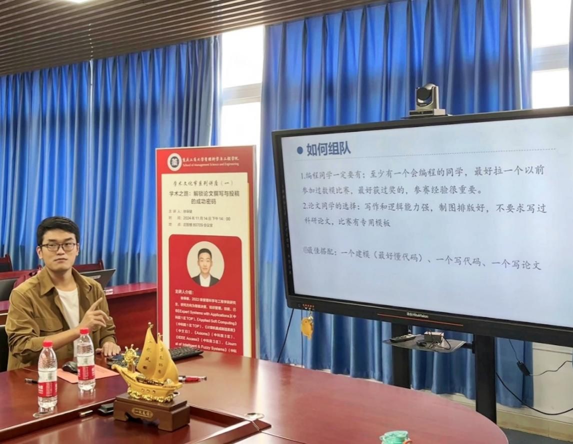 王浩臣同学则以“研梦启航,竞逐荣耀:研究生学科竞赛参赛经验分享”为主题,分享了他在学科竞赛中的宝贵经历与技巧。他通过参加“华为杯”研究生数学建模大赛和“互联网+”大学生创新创业大赛的实例,为同学们揭示了学科竞赛的制胜秘诀。在“华为杯”研究生数学建模大赛中,他作为队长带领团队荣获国家三等奖,并分享了如何组队、选题及获奖的关键策略。同时,他还详细讲解了“互联网+”大学生创新创业大赛的五个重点:创新点选取、团队建设、资源整合、细节把握及格局拓展,为听众提供了参赛的清晰思路与有效方法。