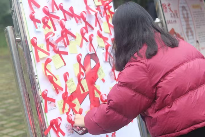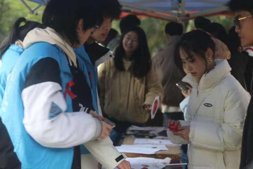 志愿者们身着统一服装,引导大家参与答题抽奖活动,以此来普及预防艾滋病的相关知识。答完题后,便是“共享青春祝福贴,传递爱的红丝带”活动,即使只有简陋的一张便利贴和一根红丝带。但是也因为参与者对生命的尊重和关爱而变得更有意义,每一张便利贴都承载着一份对防艾的关注、一份对生命的尊重。那记录细腻的祝福的便利贴,仿佛能触摸到书写者的真心与关怀。飘扬的红丝带像一条纽带,将世界人民紧紧联系在一起,共同抗击艾滋病。它象征着对艾滋病病毒感染者和病人的关心与支持,也象征着对生命的热爱和对平等的追求,鼓励大家用“心”来参与艾滋病防治工作。