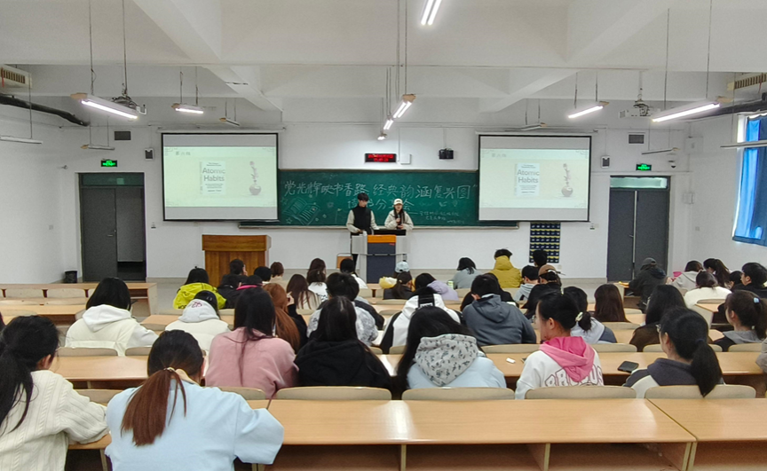 活动现场,七组同学依次分享了《狂人日记》《活着》《红楼梦》《明朝那些事儿》《红星照耀中国》《Atomic Habits》(原子习惯)《平凡的世界》等经典书籍。分享者以生动的语言、深刻的见解,结合PPT、视频等多媒体形式,带领现场观众走进不同时代的文学世界与思想长河。