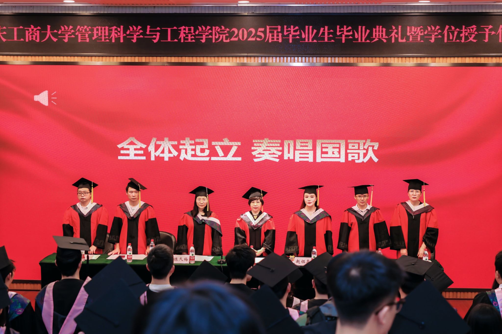 毕业典礼在激昂的国歌声中拉开序幕,全体师生起立,奏唱《中华人民共和国国歌》。