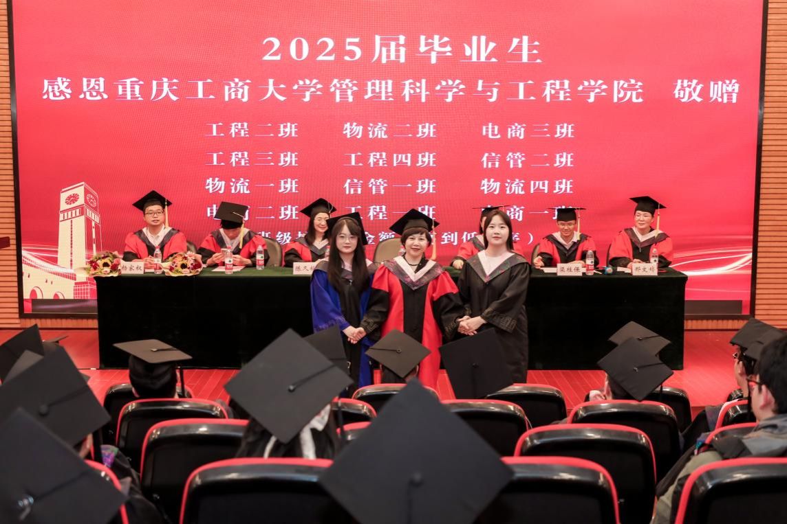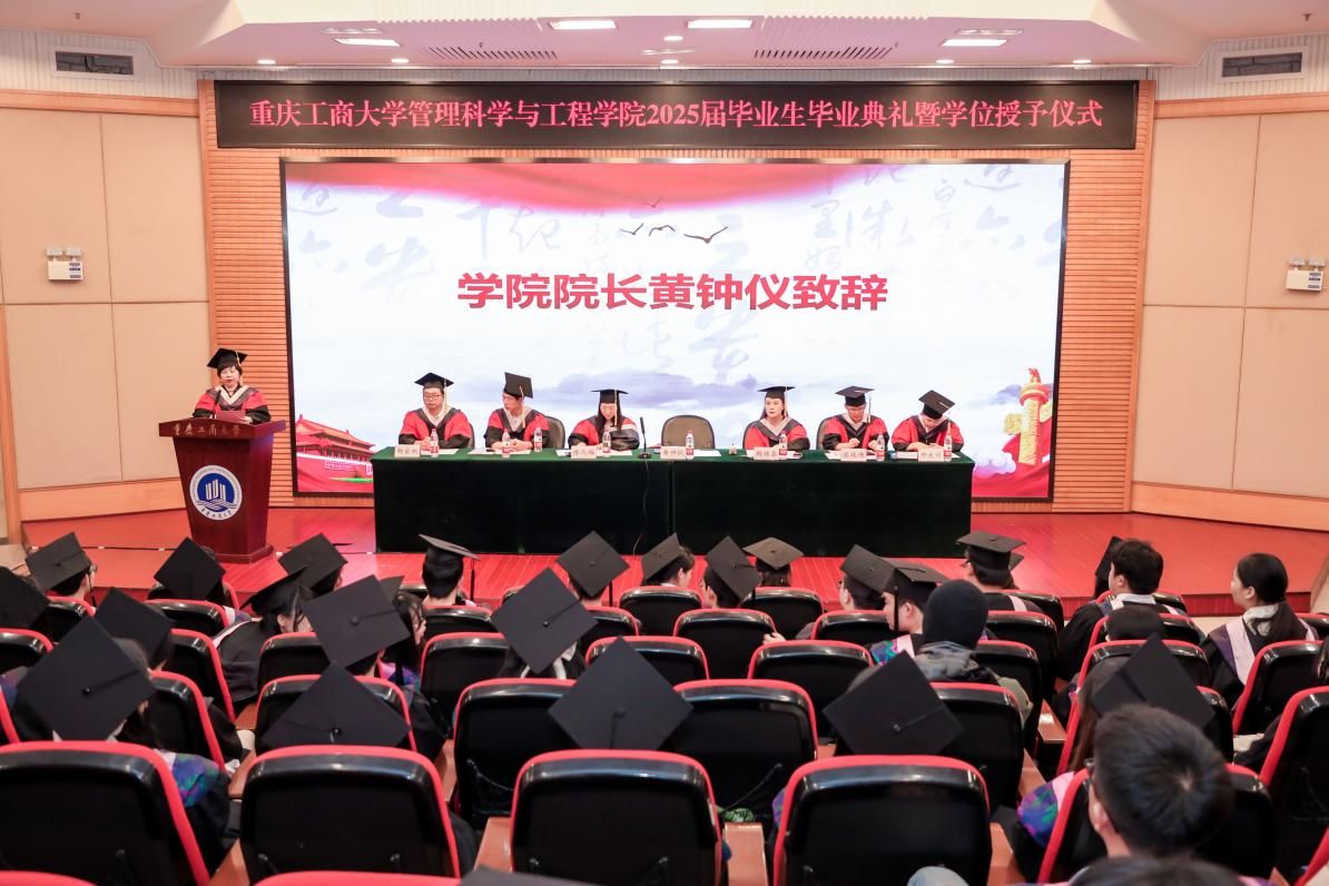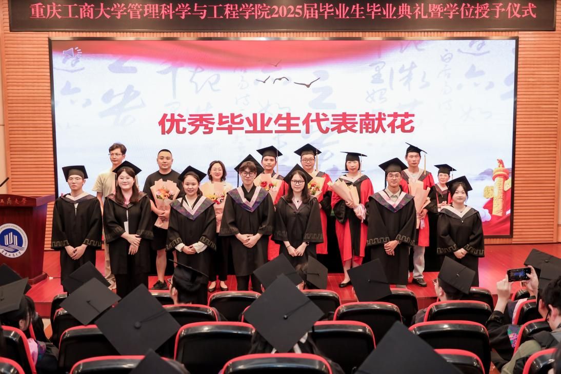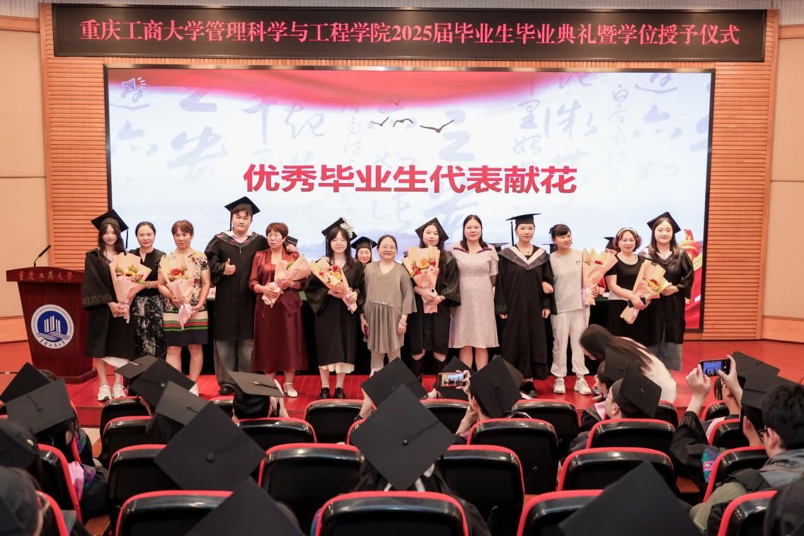 前行不忘引路人。教师代表工程管理系梅中亚老师以“成长、感恩、勇气、初心”四个关键词,深情回顾了同学们从建模少年成长为智慧时代“系统优化者”的历程,鼓励毕业生们以感恩之心面对未来,以勇气迎接挑战,坚守初心,砥砺前行。