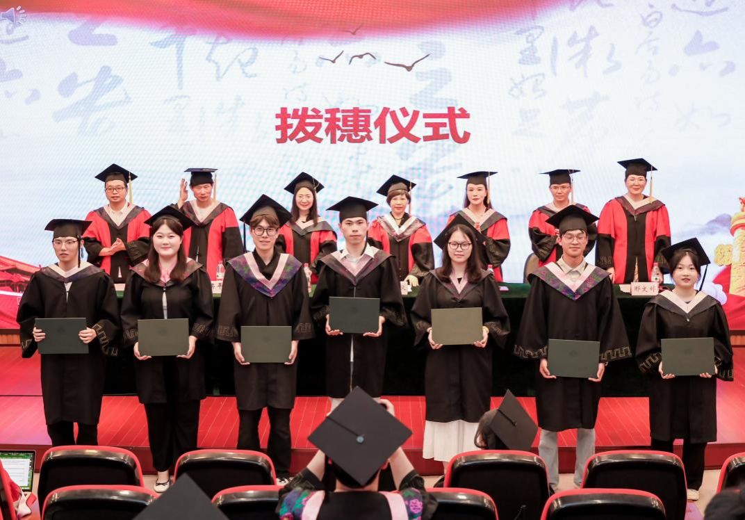 学院副院长梁桂保宣读了《关于授予2025届毕业生学位的决定》,毕业生们依次上台,由学院领导及教师代表为他们拨穗正冠,授予学位。这一刻,标志着他们正式完成了学业,即将踏上人生新的征程。