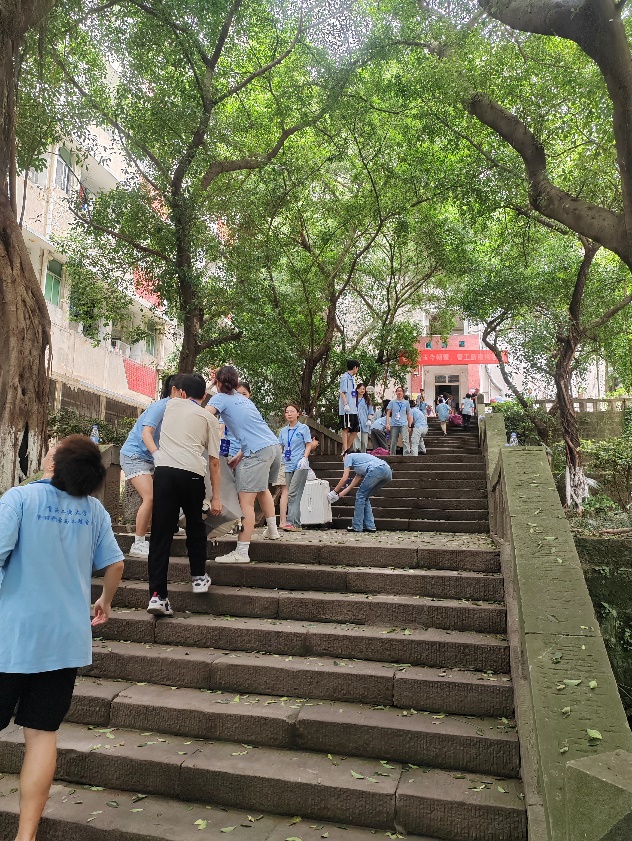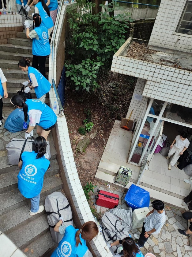 搬迁当日,学院师生全员上阵,校园里处处涌动着团结互助的热潮。由党员服务站、楼管会招募的160余名志愿者,分散在南区七栋、北区十二栋、北区二十三栋和北区四栋,成为搬迁现场最亮眼的力量。当第一辆满载行李的班车驶入南岸校区,各个楼栋即刻搭起 “人力传送带”—— 志愿者与 24 级学生默契配合,以 “人浪” 传递的方式,将一件件行李快速转运至指定区域,高效衔接的搬运节奏,让原本繁琐的搬迁流程变得顺畅有序,用实际行动诠释着管工学院的凝聚力与向心力 。